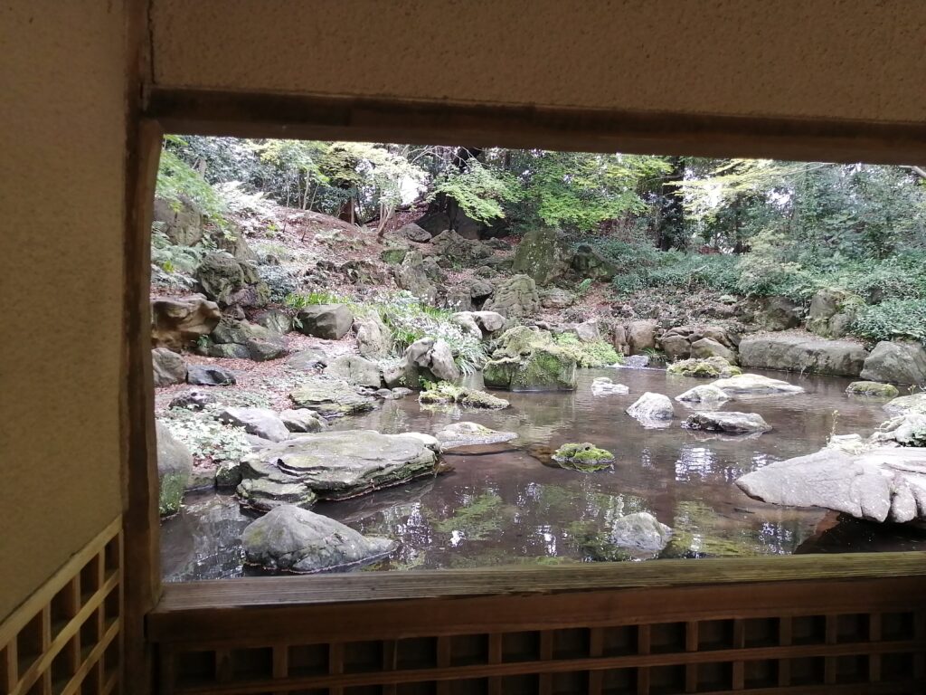 東屋の周りを渓流が走り、中から滝や石組みの景観や水音が楽しめるようになっていて冷涼感満載です。